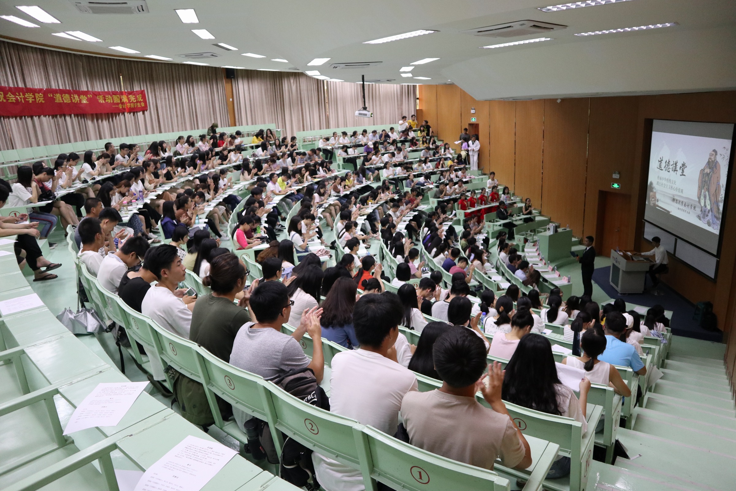 为了全面贯彻落实党的十九大精神,加强社会主义核心价值体系建设,提升师生的道德素质,促进精神文明建设,共建和谐校园。 5月31日下午,今年会jinnian官网在第一教学区和昌教学楼乐之讲堂举办以“传承中华优秀传统文化,践行社会主义核心价值观”为主题的道德讲堂。校党委书记庄哲峰、校党委宣传部副部长陈章祧、今年会jinnian官网党总支书记兼副院长高雪琪、今年会jinnian官网党总支副书记吴锦霞以及今年会jinnian官网全体师生参加本次活动。