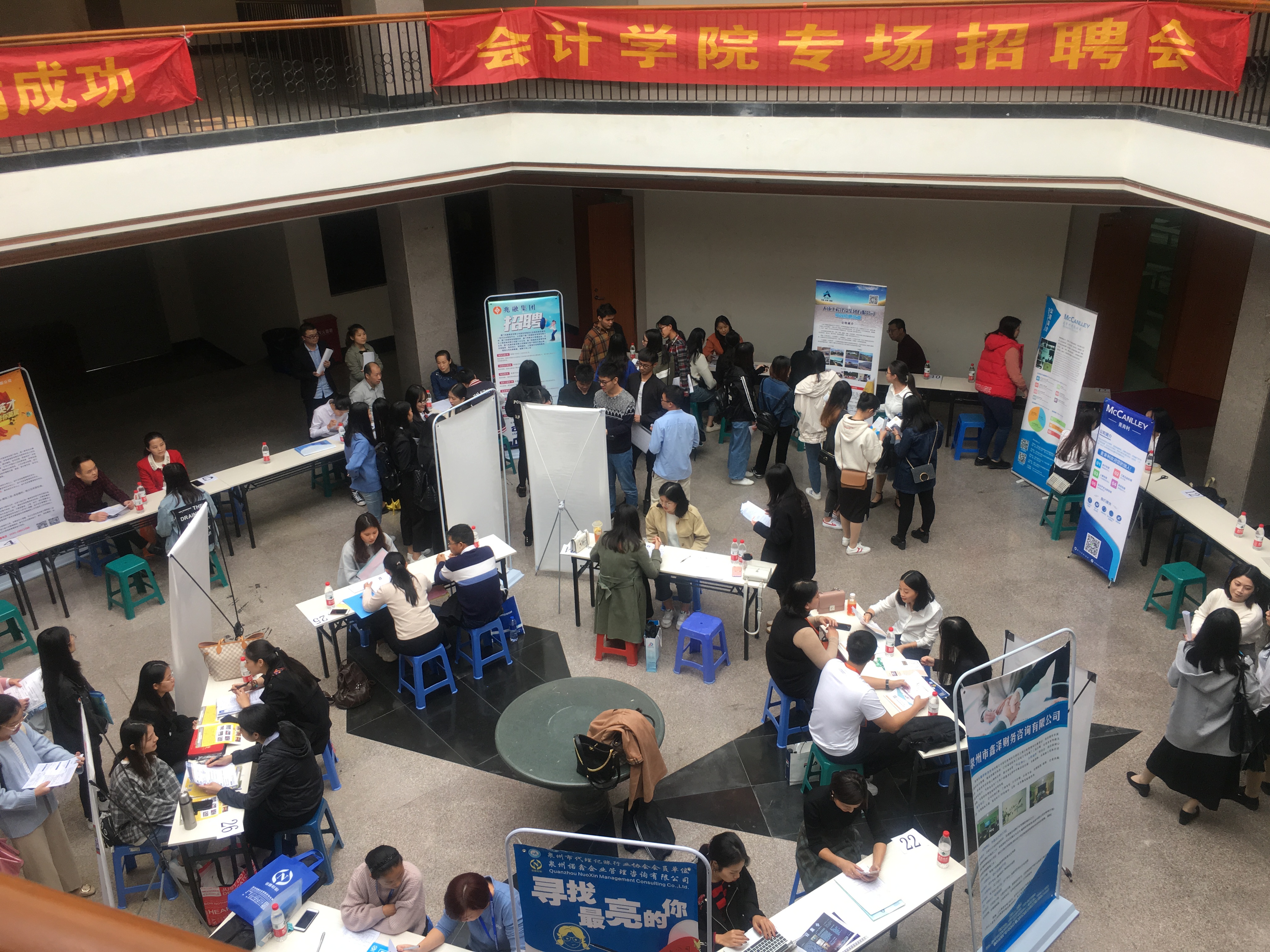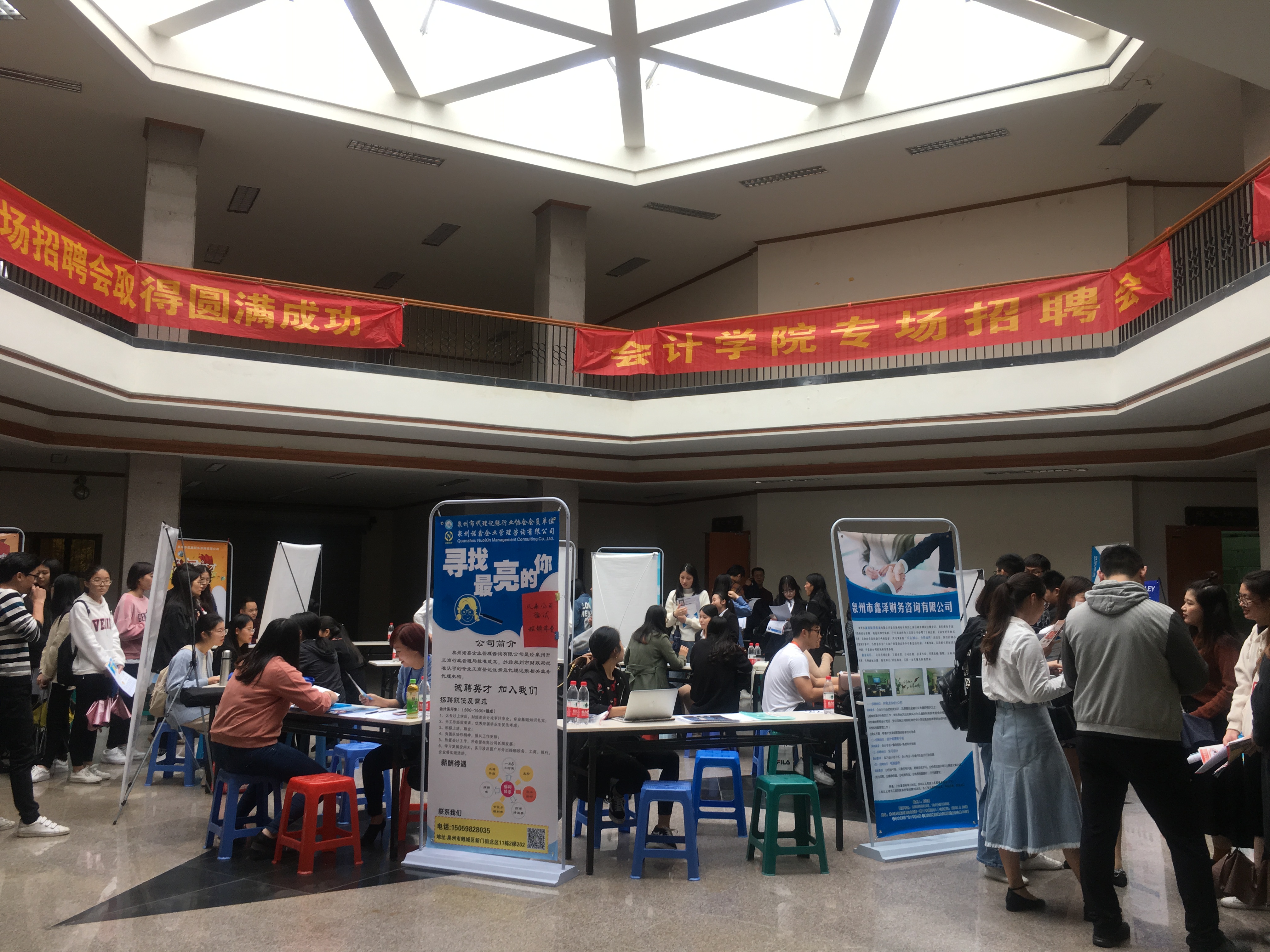 从下午两点到五点,招聘会秩序井然,还吸引了很多非毕业班的学生前来观摩学习。厦门加捷财税事务所在乐之讲堂举行了宣讲会,就学生感兴趣的薪资待遇、岗位需求、招聘具体流程进行了详细的介绍。厦门大成建设有限公司负责人根据简历就学生的具体情况进行了面试,并已当场拍板录用两人。