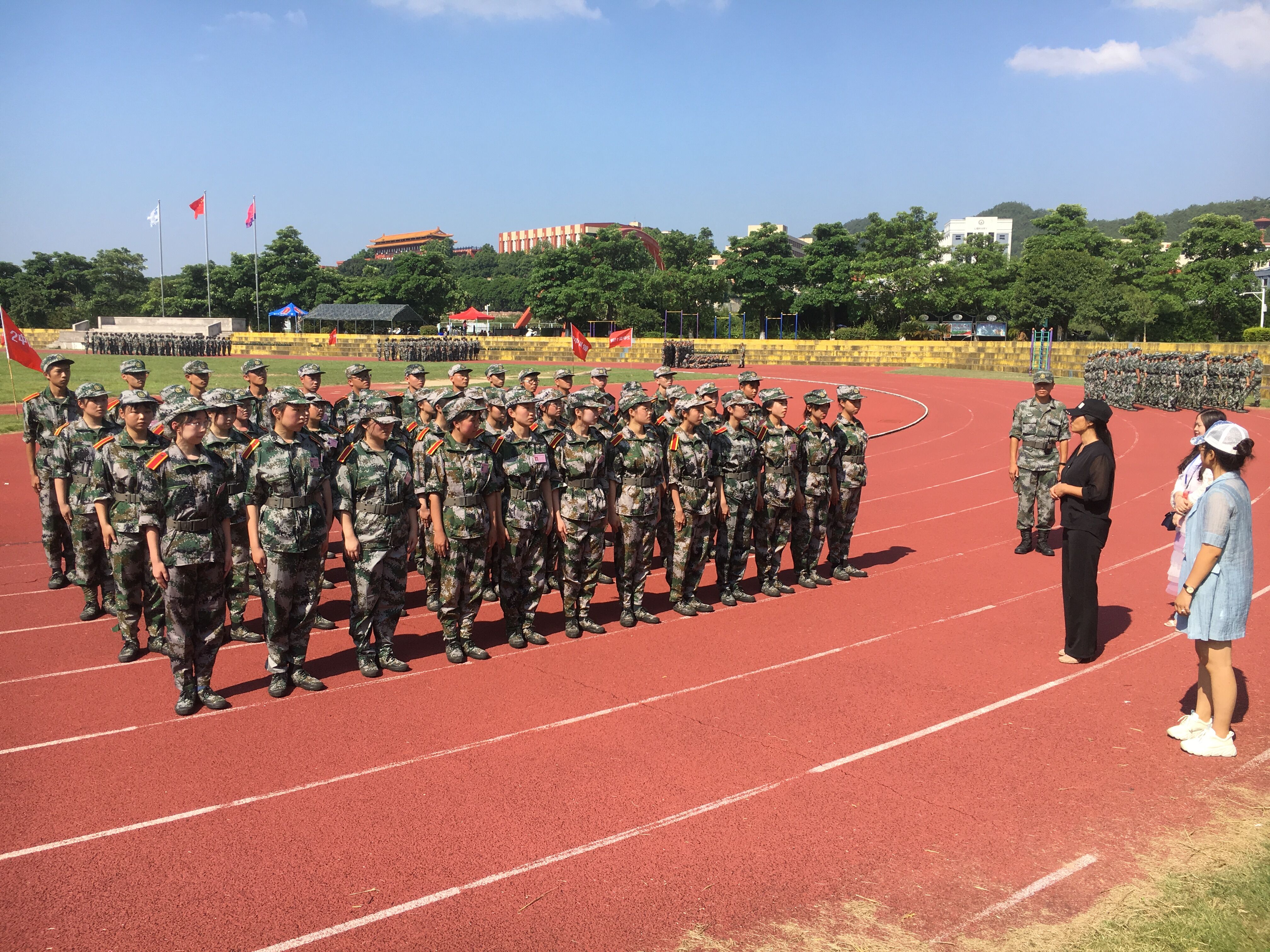 炎炎烈日,新生们军姿挺拔,昂首阔步,彰显大学生的青春与活力。何院长一行,趁着学生修整之时,来到训练场看望新生并给予他们亲切的问候,对同学们在军训中表现出的顽强拼搏、吃苦耐劳的精神和作风给予了充分赞扬。她鼓励学生珍惜军训的机会,磨练自己的意志,攻坚克难,养成艰苦奋斗的意志和良好的生活习惯。随后,她还向带队教官了解新生军训情况,并对教官的辛苦付出表示感谢。