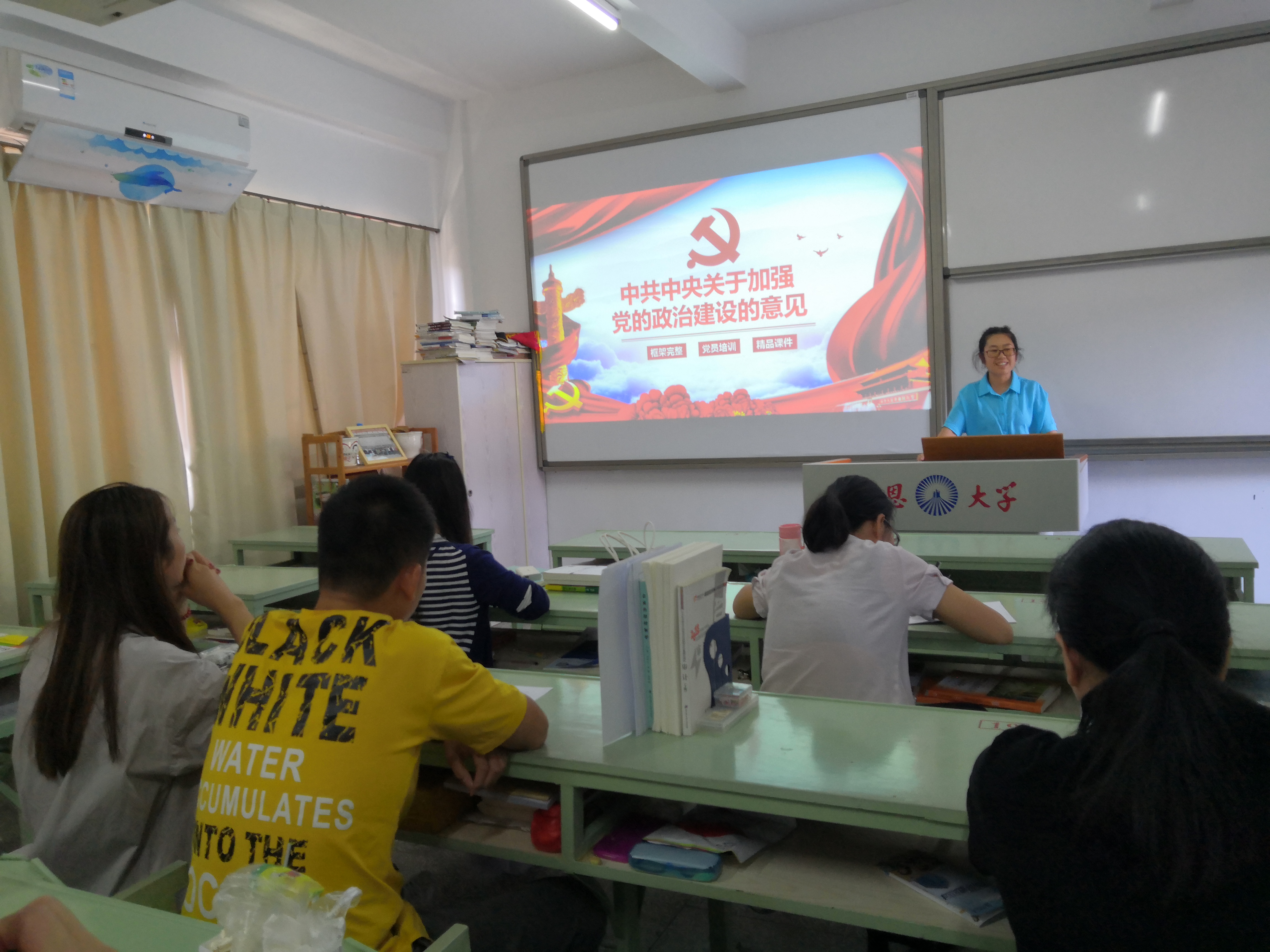 紧接着,与会人员分享专题学习心得,党总支副书记吴锦霞认为,党员同志应该要把党的政治建设理念放在首位,作为辅导员,通过多种途径向学生展示党的相关理论知识,立德树人,在育人的同时,要以理论武装头脑;教师党员彭雪在分享中提到:“作为教师党员,首先要坚定政治立场,有严谨的工作作风”;辅导员蔡米糠同志说:“党员教师应该要对学生做好思想政治工作,为学生树立好榜样,带来好的影响”。