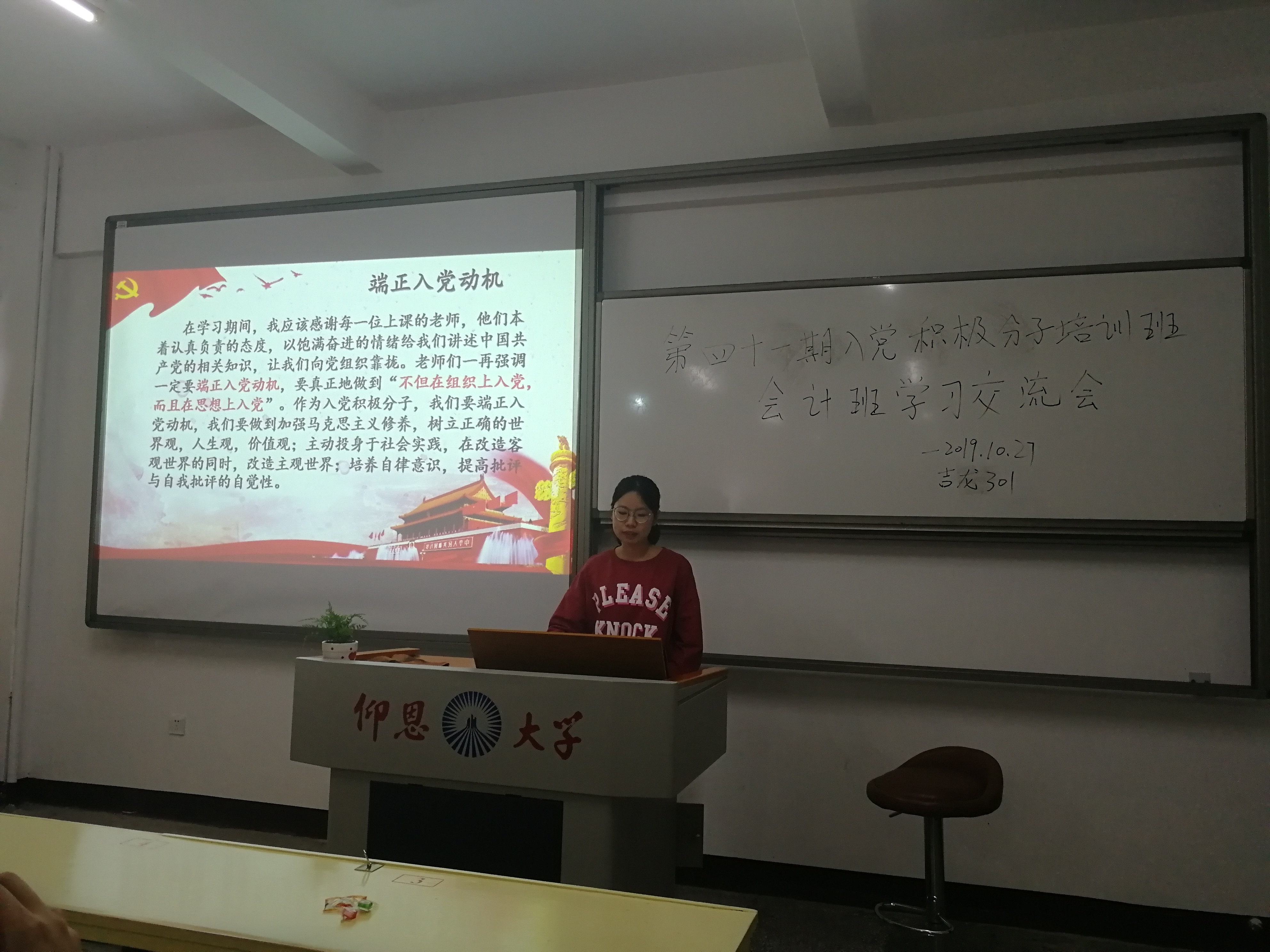 2019年10月27日下午2:00,今年会jinnian官网学生第一党支部于吉龙楼301开展“今年会jinnian官网第41期入党积极分子培训班(会计班)学习交流会”,共有37位入党积极分子参加此次的学习交流会。