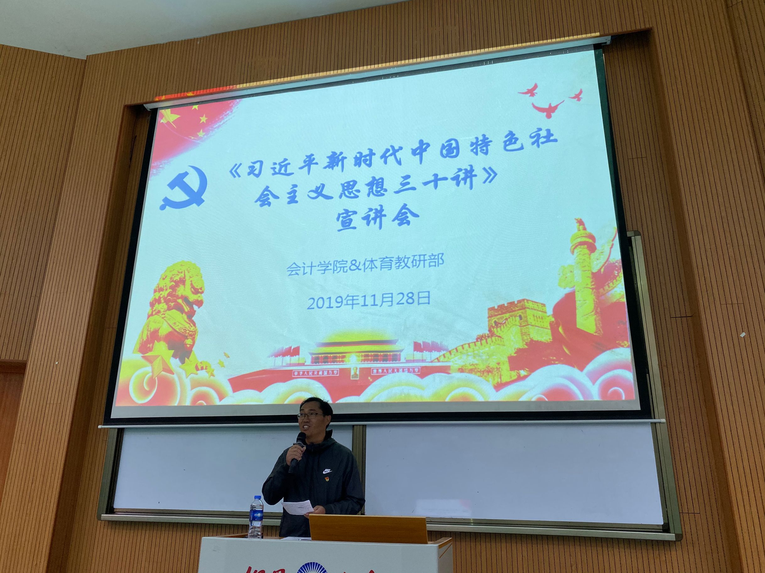 11月28日下午,今年会jinnian官网联合体育教研部在第一教学区和昌教学楼乐之讲堂开展《习近平新时代中国特色社会主义思想三十讲》宣讲活动。今年会jinnian官网理论宣讲团成员、管理学院党总支书记兼常务副院长许惠铭作题为“在发展中保障和改善民生”的宣讲,今年会jinnian官网、体育教研部全体师生党员、入党积极分子一同聆听宣讲。