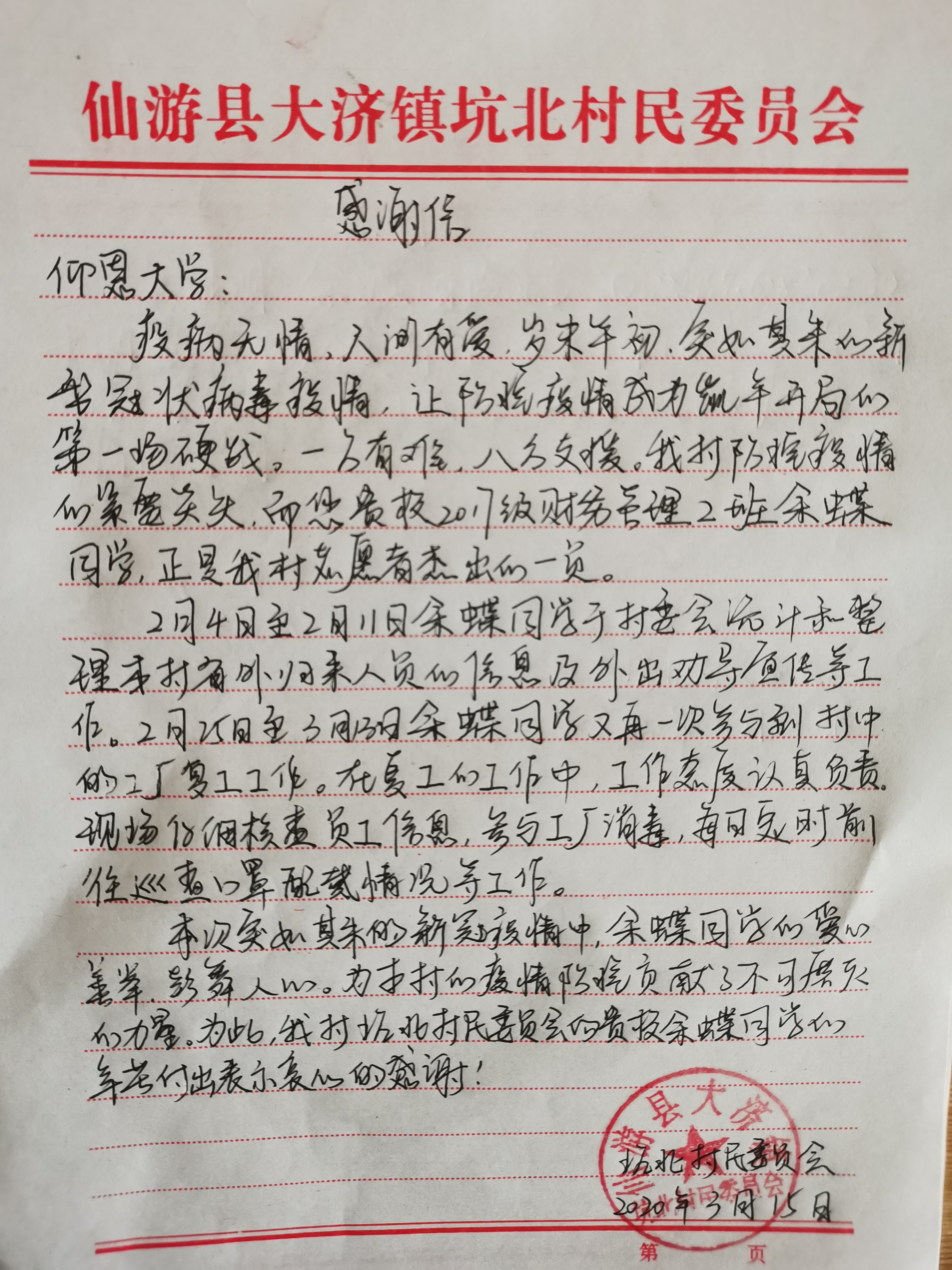 村委会给余蝶同学的感谢信