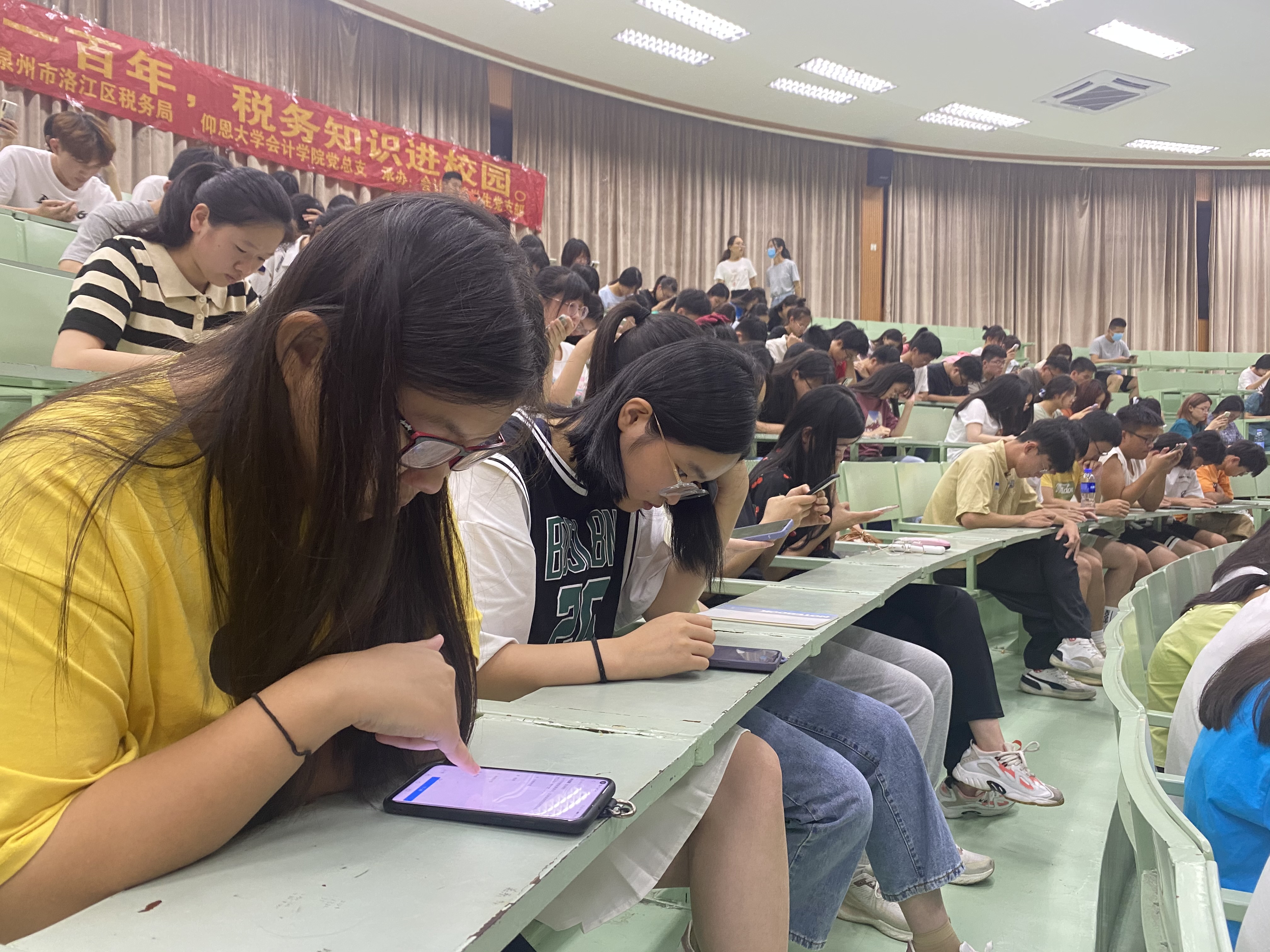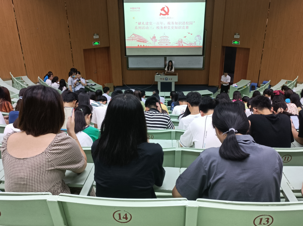 7月11日晚19:00,今年会jinnian官网党总支联合泉州市洛江税务局在今年会jinnian官网第一教学区和昌教学楼乐之讲堂开展以“献礼建党一百年,税务知识进校园”为主题的党史和税务知识竞赛。今年会jinnian官网党总支书记高雪琪、国家税务总局泉州市洛江区税务局机关党委专职副书记王容容、今年会jinnian官网师生等到场观看了此次知识竞赛。