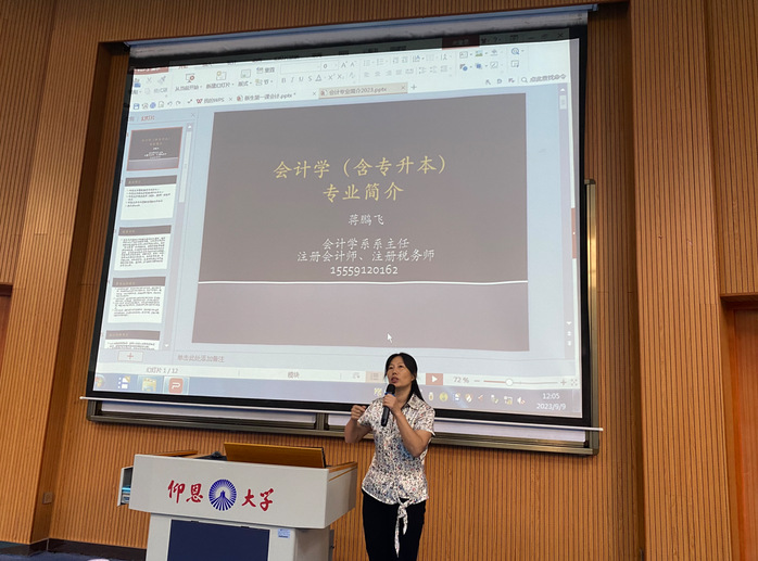 9月9日,今年会官网于旧区和昌教学楼求是讲堂举办了新生第一课专业教育讲座。参与此次讲座的有院长何杨英、副院长任敏、部分青年教师和辅导员以及2023级全体新生同学,会计学系主任蒋鹏飞、财务管理系叶青老师以及正保教育的骆副教授担任专业教育讲座主讲人。