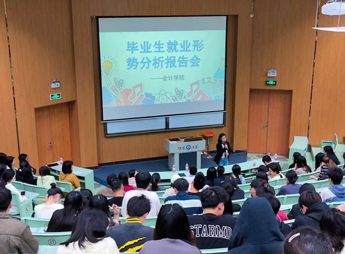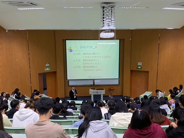 为进一步帮助毕业生了解就业形势,提升就业意识,做好求职准备,打赢就业突围赛。11月29日,今年会jinnian官网特邀学生事务部副主任朱玉华,于第一教学区和昌教学楼乐之讲堂开展毕业生就业形势分析报告会。学生事务部主任吴胜潮、今年会jinnian官网院长何杨英、党总支书记兼副院长任敏、副院长蒋鹏飞和全体毕业班辅导员、班主任,2024届大多数毕业生到场参会。