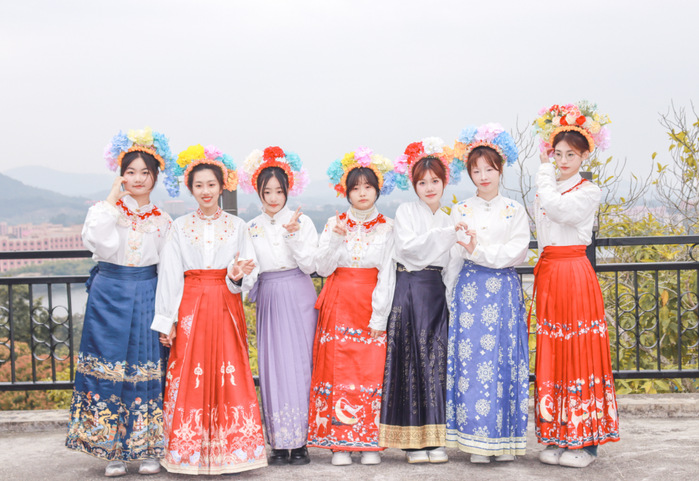 泉州蟳埔簪花文化是一种独特的传统习俗,大家把浪漫与春天戴在头上,寓意着一切充满希望。束发、缠成发髻、插入发簪……蟳蜅女们巧手翻飞,将一朵朵娇艳的花轻轻地簪在女生们的发间。女生们身着心仪的马面裙、旗袍,发髻上的琉璃花在阳光下熠熠生辉,与女生们的笑颜相映成趣,勾勒出青春靓丽的动人画面。