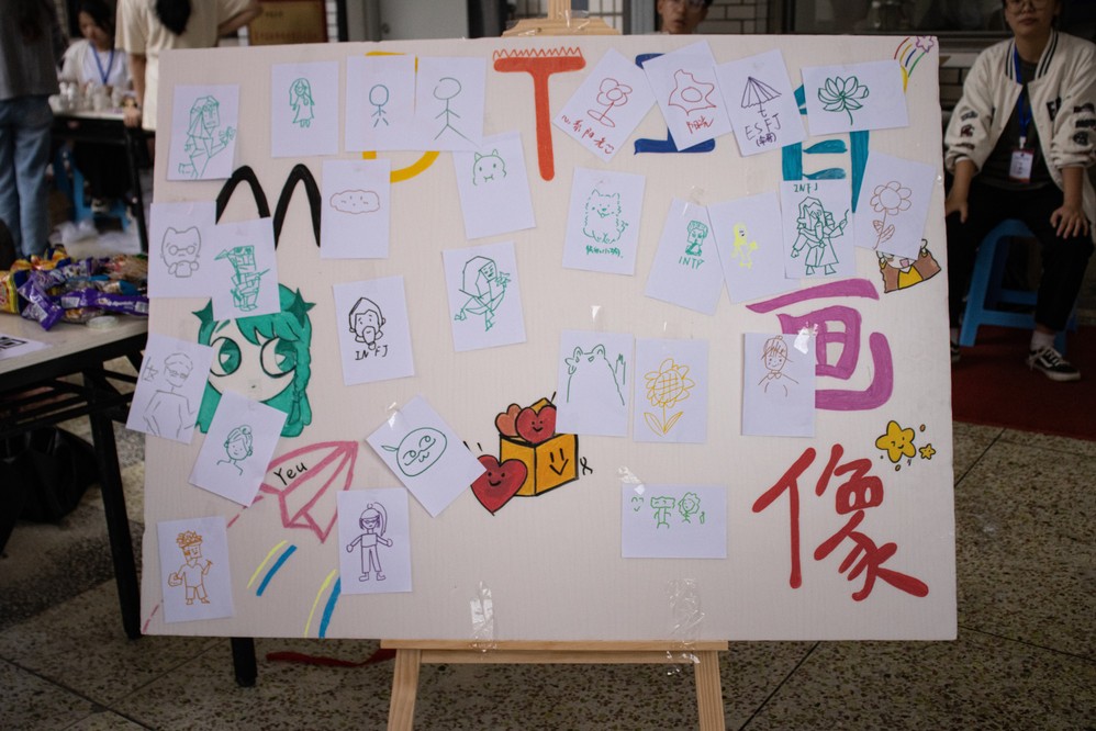 活动区共设置了九个游戏集章点,集趣味性、挑战性于一体,同学们完成游戏即可获取印章,集齐后可到终点处兑换奖品。人头攒动的游戏集章点,不时传出同学们挑战成功的欢呼声。其中,OH卡体验活动站点及MBTI测试站点最受同学们的关注,吸引了大量参与者。OH卡体验活动站站点负责人根据参与者随机选出的OH卡,为他们心中的烦恼提出建议;在MBTI测试站点,参与者通过回答相关问题获取自己的MBTI属性,并画出自画像。