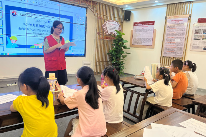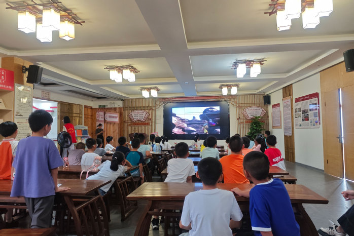 清晨,队员们带领孩子们进行晨读,经典篇章的诵读声唤醒清晨的活力。晨练环节中,趣味跑等运动让孩子们在阳光下舒展身体,增强体质。活动期间,队员协助社区老师开展写作讲座,以生动案例激发孩子们的表达欲望,增强孩子们的语言表达能力。同时,《飞屋环游记》观影活动,在观影中向孩子们传递坚持与友爱的信念。